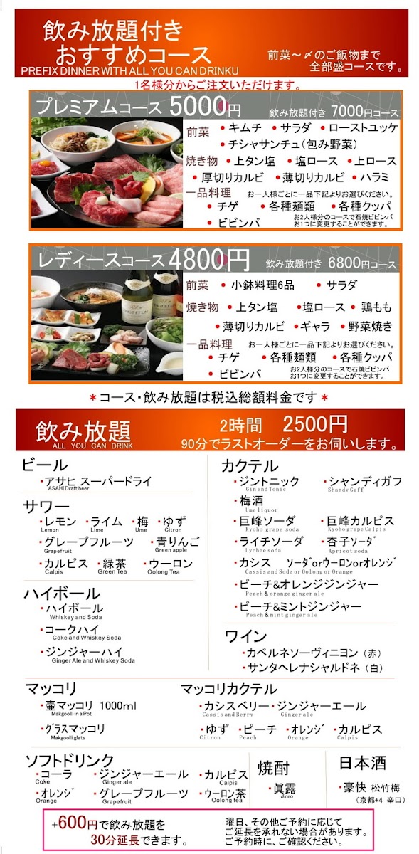 Recommended Course: For just JP¥2,500, enjoy a two-hour drink-all-you-can experience alongside exquisite dishes like tanshio, shiro-rosu, and bibimbap.